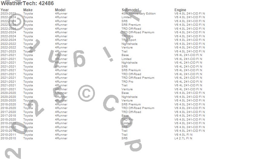 Below is an abbreviated list of applications for the Cargo Liner.4Runner, Toyota, 2024, 2023, 2022, 2021, 2020, 2019, 2018, 2017, 2016, 2015, 2014, 2013, 2012, 2011, 2010