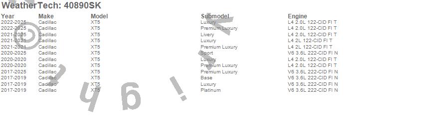 Below is an abbreviated list of applications for the Cargo Liner w/Bumper Protector.XT5, Cadillac, 2025, 2024, 2023, 2022, 2021, 2020, 2019, 2018, 2017