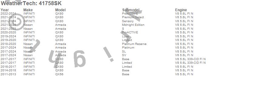 Below is an abbreviated list of applications for the Cargo Liner w/Bumper Protector.Armada, QX56, QX80, INFINITI, Nissan, 2024, 2023, 2022, 2021, 2020, 2019, 2018, 2017, 2016, 2015, 2014, 2013, 2012, 2011