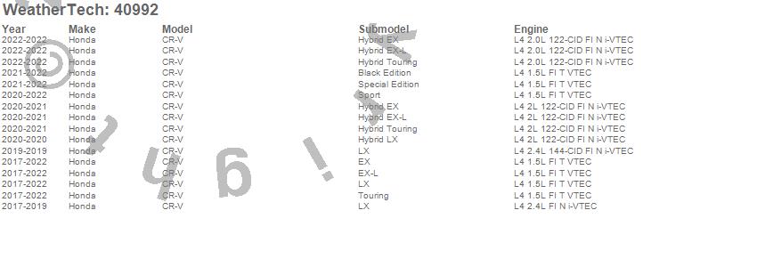 Below is an abbreviated list of applications for the Cargo Liner.CR-V, Honda, 2022, 2021, 2020, 2019, 2018, 2017