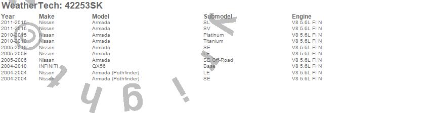 Below is an abbreviated list of applications for the Cargo Liner w/Bumper Protector.Armada, Armada (Pathfinder), QX56, INFINITI, Nissan, 2015, 2014, 2013, 2012, 2011, 2010, 2009, 2008, 2007, 2006, 2005, 2004