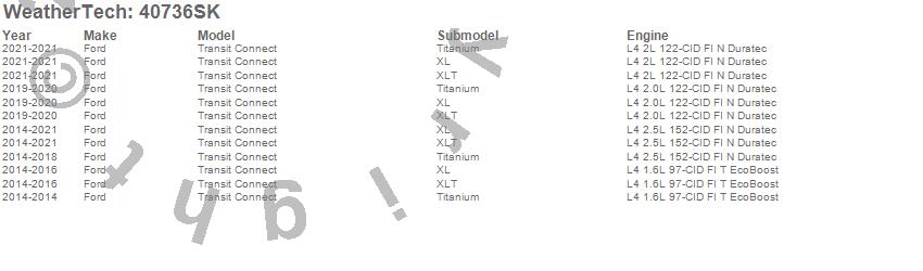 Below is an abbreviated list of applications for the Cargo Liner w/Bumper Protector.Transit Connect, Ford, 2021, 2020, 2019, 2018, 2017, 2016, 2015, 2014