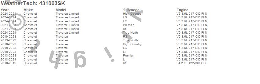 Below is an abbreviated list of applications for the Cargo Liner w/Bumper Protector.Traverse, Traverse Limited, Chevrolet, 2024, 2023, 2022, 2021, 2020, 2019, 2018