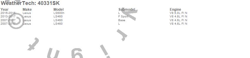 Below is an abbreviated list of applications for the Cargo Liner w/Bumper Protector.LS460, LS600h, Lexus, 2017, 2016, 2015, 2014, 2013, 2012, 2011, 2010, 2009, 2008, 2007