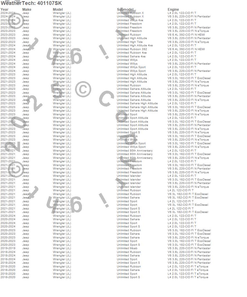 Below is an abbreviated list of applications for the Cargo Liner w/Bumper Protector.Wrangler, Wrangler (JL), Jeep, 2026, 2025, 2024, 2023, 2022, 2021, 2020, 2019, 2018