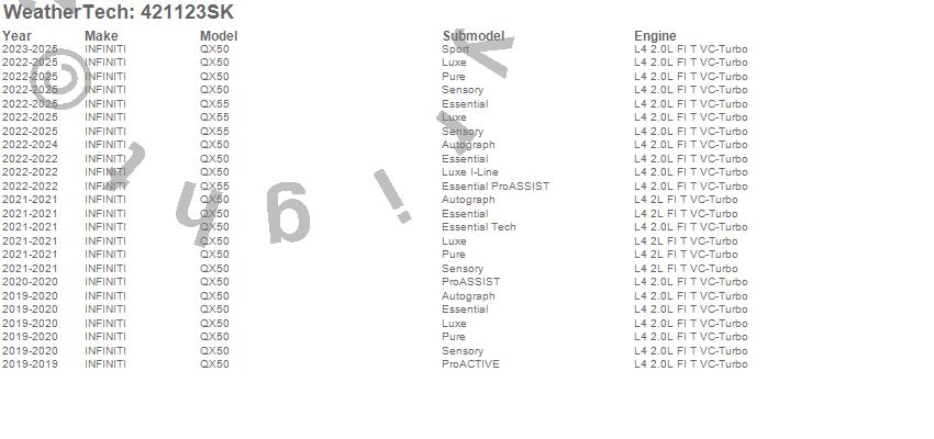 Below is an abbreviated list of applications for the Cargo Liner w/Bumper Protector.QX50, QX55, INFINITI, 2025, 2024, 2023, 2022, 2021, 2020, 2019