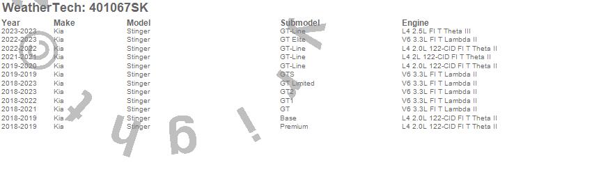 Below is an abbreviated list of applications for the Cargo Liner w/Bumper Protector.Stinger, Kia, 2023, 2022, 2021, 2020, 2019, 2018