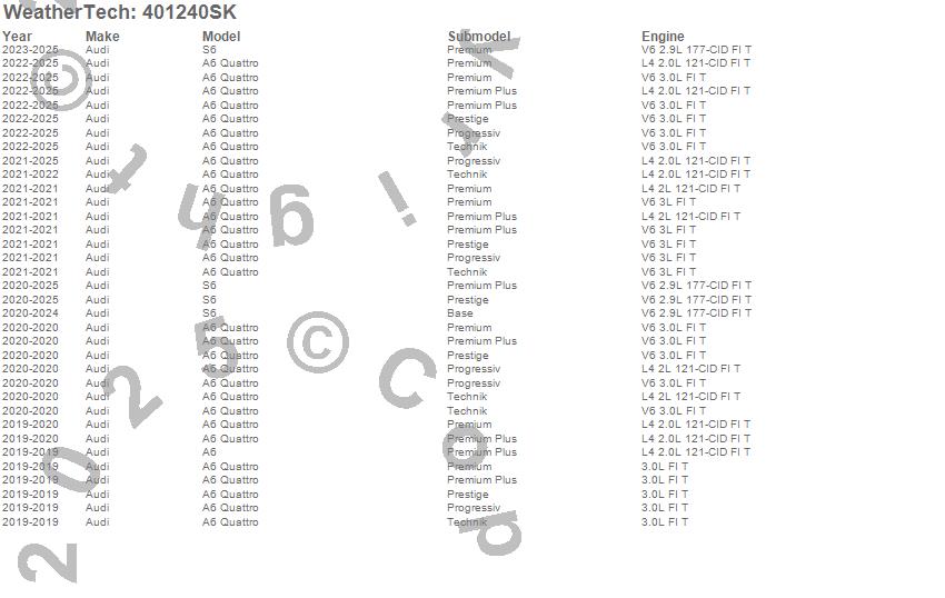 Below is an abbreviated list of applications for the Cargo Liner w/Bumper Protector.A6, A6 Quattro, S6, Audi, 2025, 2024, 2023, 2022, 2021, 2020, 2019