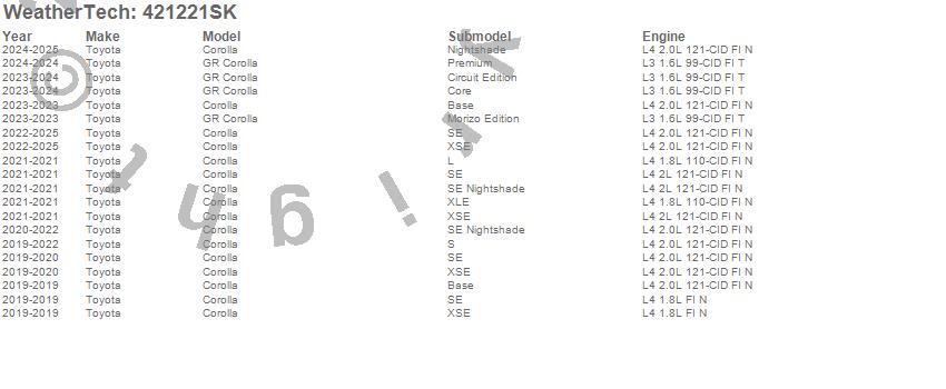 Below is an abbreviated list of applications for the Cargo Liner w/Bumper Protector.Corolla, GR Corolla, Toyota, 2025, 2024, 2023, 2022, 2021, 2020, 2019