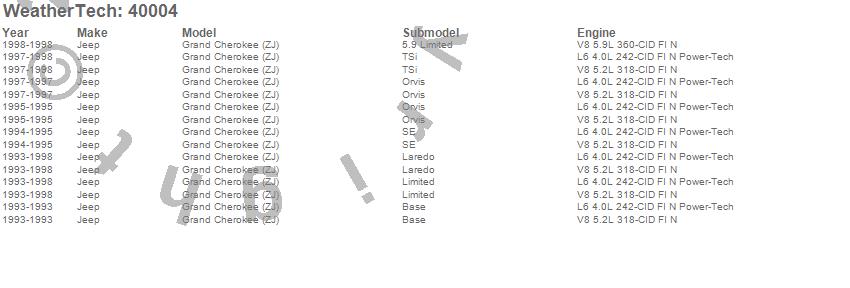 Below is an abbreviated list of applications for the Cargo Liner.Grand Cherokee (ZJ), Jeep, 1998, 1997, 1996, 1995, 1994, 1993