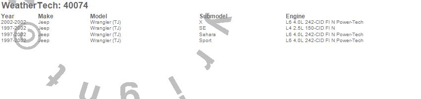 Below is an abbreviated list of applications for the Cargo Liner.Wrangler (TJ), Jeep, 2002, 2001, 2000, 1999, 1998, 1997