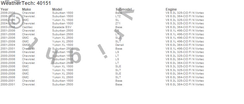 Below is an abbreviated list of applications for the Cargo Liner.Escalade ESV, Suburban 1500, Suburban 2500, Yukon XL 1500, Yukon XL 2500, Cadillac, Chevrolet, GMC, 2006, 2005, 2004, 2003, 2002, 2001, 2000