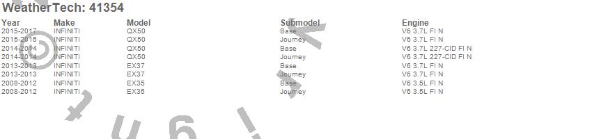 Below is an abbreviated list of applications for the Cargo Liner.EX35, EX37, QX50, INFINITI, 2017, 2016, 2015, 2014, 2013, 2012, 2011, 2010, 2009, 2008