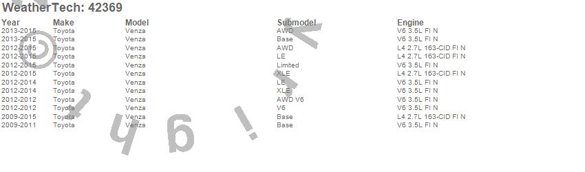 Below is an abbreviated list of applications for the Cargo Liner.Venza, Toyota, 2015, 2014, 2013, 2012, 2011, 2010, 2009