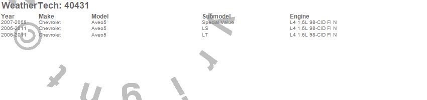 Below is an abbreviated list of applications for the Cargo Liner.Aveo, Aveo5, Chevrolet, 2011, 2010, 2009, 2008, 2007, 2006