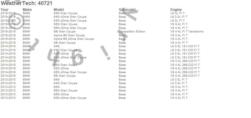 Below is an abbreviated list of applications for the Cargo Liner.640i, 640i Gran Coupe, 640i xDrive, 640i xDrive Gran Coupe, 650i, 650i Gran Coupe, 650i xDrive, 650i xDrive Gran Coupe, Alpina B6 Gran Coupe, Alpina B6 xDrive Gran Coupe, M6 Gran Coupe, BMW, 2019, 2018, 2017, 2016, 2015, 2014, 2013