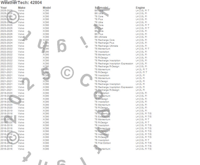 Below is an abbreviated list of applications for the Cargo Liner.XC90, Volvo, 2026, 2025, 2024, 2023, 2022, 2021, 2020, 2019, 2018, 2017, 2016