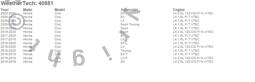 Below is an abbreviated list of applications for the Cargo Liner.Civic, Honda, 2020, 2019, 2018, 2017, 2016