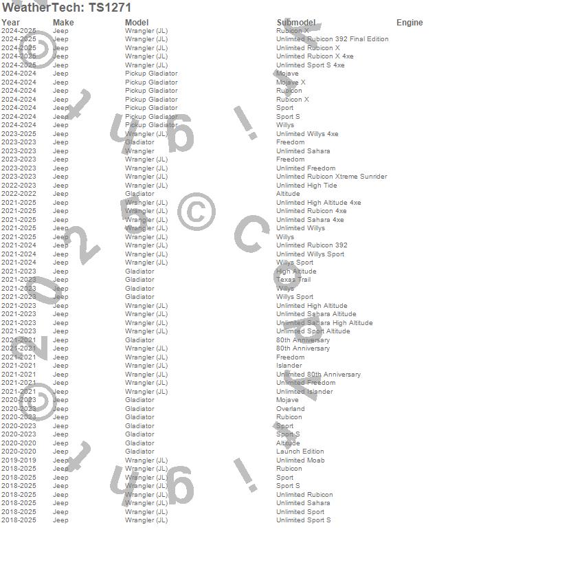 Below is an abbreviated list of applications for the WeatherTech SunShade.Gladiator, Pickup Gladiator, Wrangler, Wrangler (JL), Jeep, 2026, 2025, 2024, 2023, 2022, 2021, 2020, 2019, 2018