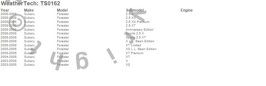Below is an abbreviated list of applications for the WeatherTech SunShade.Forester, Subaru, 2008, 2007, 2006, 2005, 2004, 2003