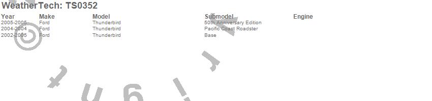 Below is an abbreviated list of applications for the WeatherTech SunShade.Thunderbird, Ford, 2005, 2004, 2003, 2002