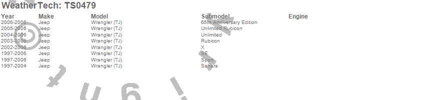 Below is an abbreviated list of applications for the WeatherTech SunShade.Wrangler (TJ), Jeep, 2006, 2005, 2004, 2003, 2002, 2001, 2000, 1999, 1998, 1997