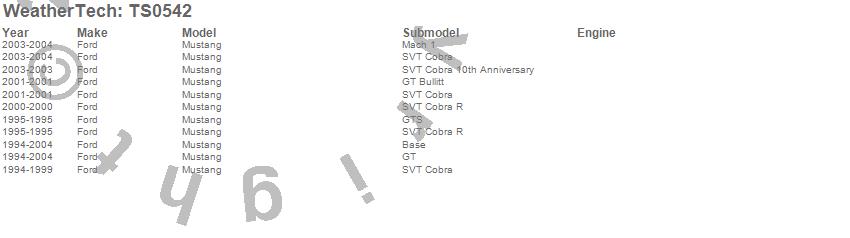 Below is an abbreviated list of applications for the WeatherTech SunShade.Mustang, Ford, 2004, 2003, 2002, 2001, 2000, 1999, 1998, 1997, 1996, 1995, 1994