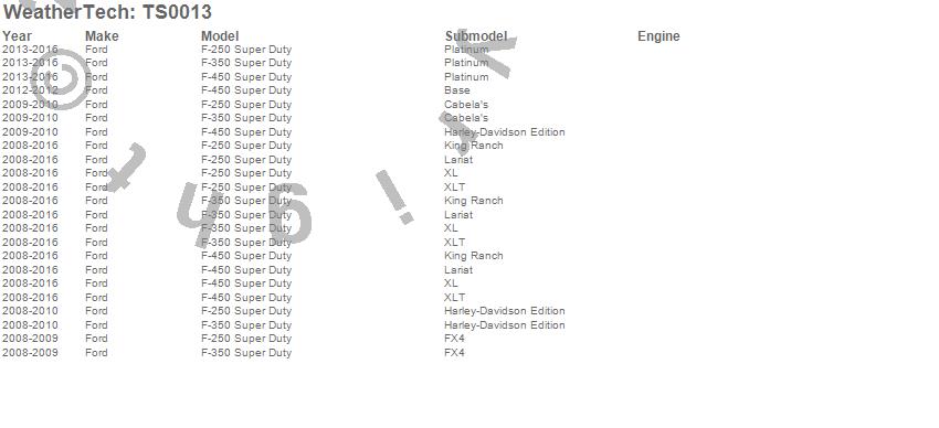 Below is an abbreviated list of applications for the WeatherTech SunShade.F-250 Super Duty, F-350 Super Duty, F-450 Super Duty, Ford, 2016, 2015, 2014, 2013, 2012, 2011, 2010, 2009, 2008