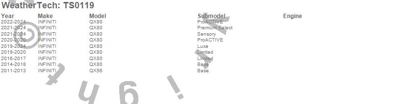 Below is an abbreviated list of applications for the WeatherTech SunShade.QX56, QX80, INFINITI, 2024, 2023, 2022, 2021, 2020, 2019, 2018, 2017, 2016, 2015, 2014, 2013, 2012, 2011