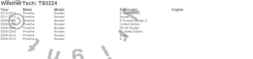 Below is an abbreviated list of applications for the WeatherTech SunShade.Boxster, Porsche, 2012, 2011, 2010, 2009, 2008, 2007, 2006, 2005