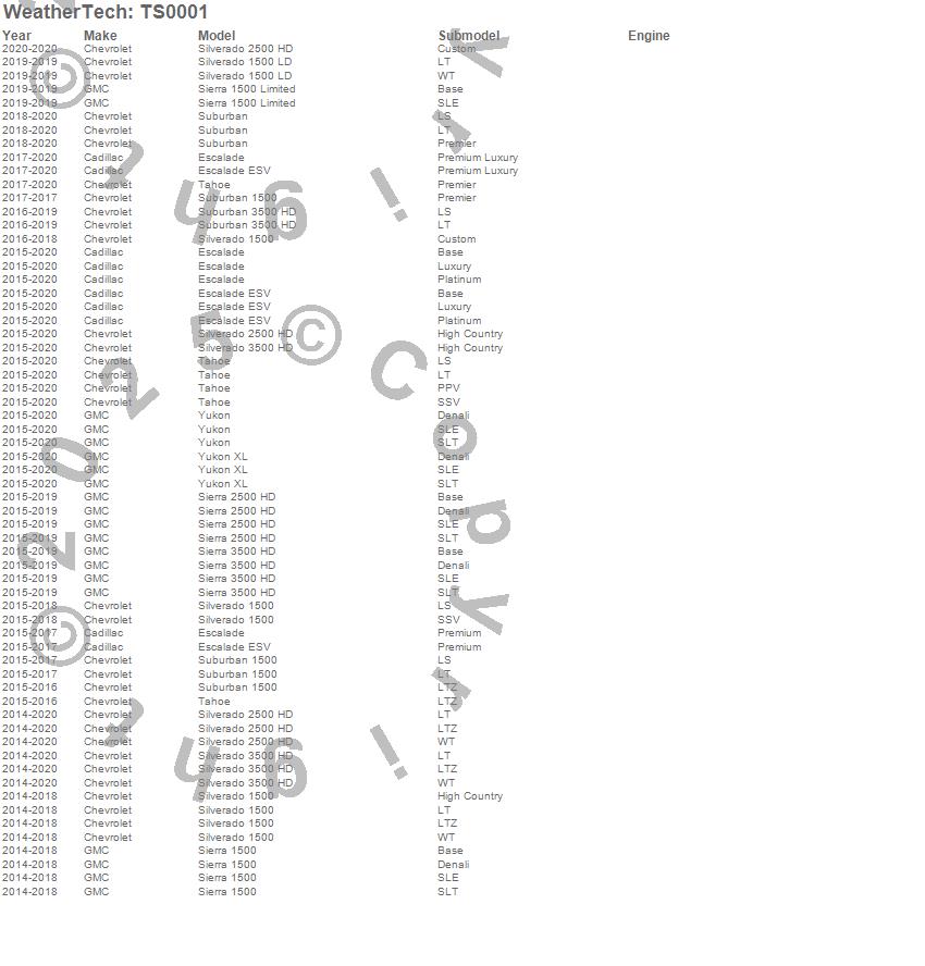 Below is an abbreviated list of applications for the WeatherTech SunShade.Escalade, Escalade ESV, Sierra 1500, Sierra 1500 Limited, Sierra 2500 HD, Sierra 3500 HD, Silverado 1500, Silverado 1500 LD, Silverado 2500 HD, Silverado 3500 HD, Suburban, Suburban 1500, Suburban 3500 HD, Tahoe, Yukon, Yukon XL, Cadillac, Chevrolet, GMC, 2020