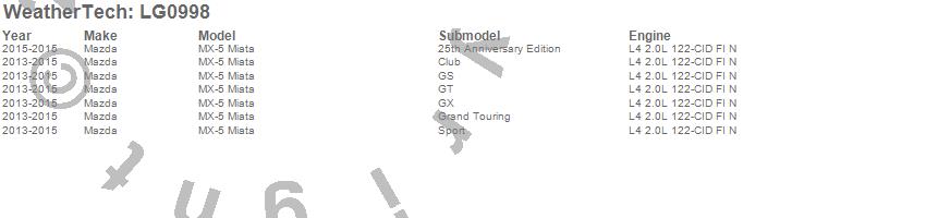 Below is an abbreviated list of applications for the LampGard.MX-5 Miata, Mazda, 2015, 2014, 2013