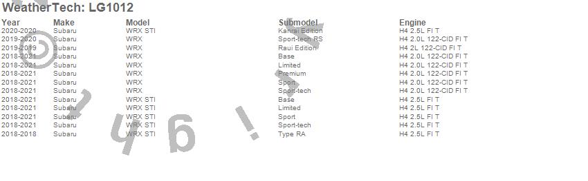 Below is an abbreviated list of applications for the LampGard.WRX, WRX STI, Subaru, 2021, 2020, 2019, 2018
