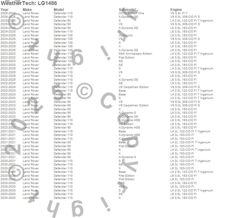 Below is an abbreviated list of applications for the LampGard.Defender 110, Defender 130, Defender 90, Land Rover, 2025, 2024, 2023, 2022, 2021, 2020