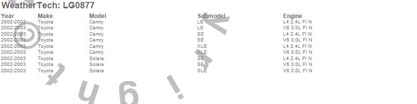 Below is an abbreviated list of applications for the LampGard.Camry, Solara, Toyota, 2003, 2002