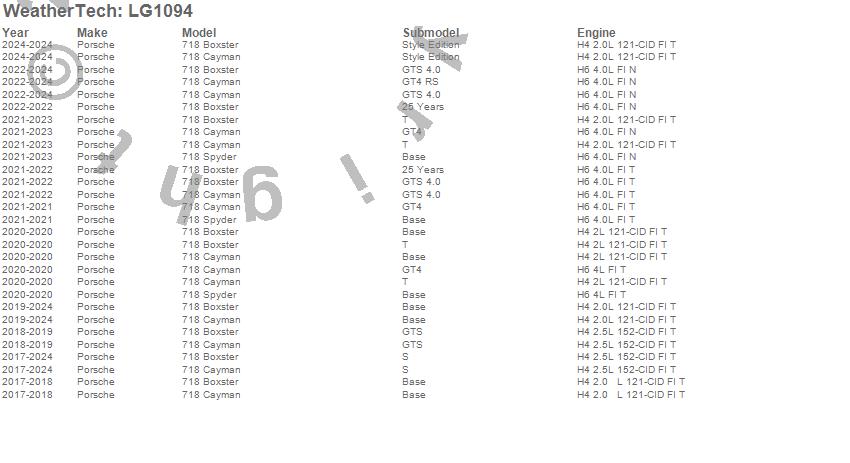 Below is an abbreviated list of applications for the LampGard.718 Boxster, 718 Cayman, 718 Spyder, Porsche, 2025, 2024, 2023, 2022, 2021, 2020, 2019, 2018, 2017
