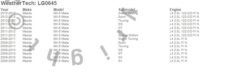 Below is an abbreviated list of applications for the LampGard.MX-5 Miata, Mazda, 2012, 2011, 2010, 2009