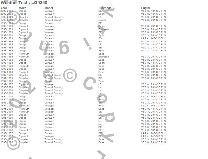 Below is an abbreviated list of applications for the LampGard.Caravan, Town & Country, Voyager, Chrysler, Dodge, Plymouth, 2000, 1999, 1998, 1997, 1996