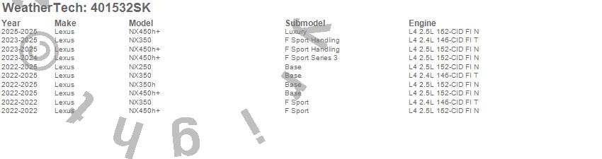 Below is an abbreviated list of applications for the Cargo Liner w/Bumper Protector.NX250, NX350, NX350h, NX450h+, Lexus, 2025, 2024, 2023, 2022