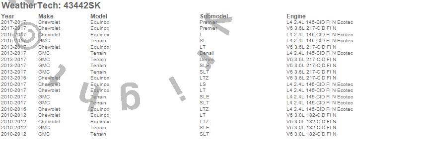 Below is an abbreviated list of applications for the Cargo Liner w/Bumper Protector.Equinox, Terrain, Chevrolet, GMC, 2017, 2016, 2015, 2014, 2013, 2012, 2011, 2010
