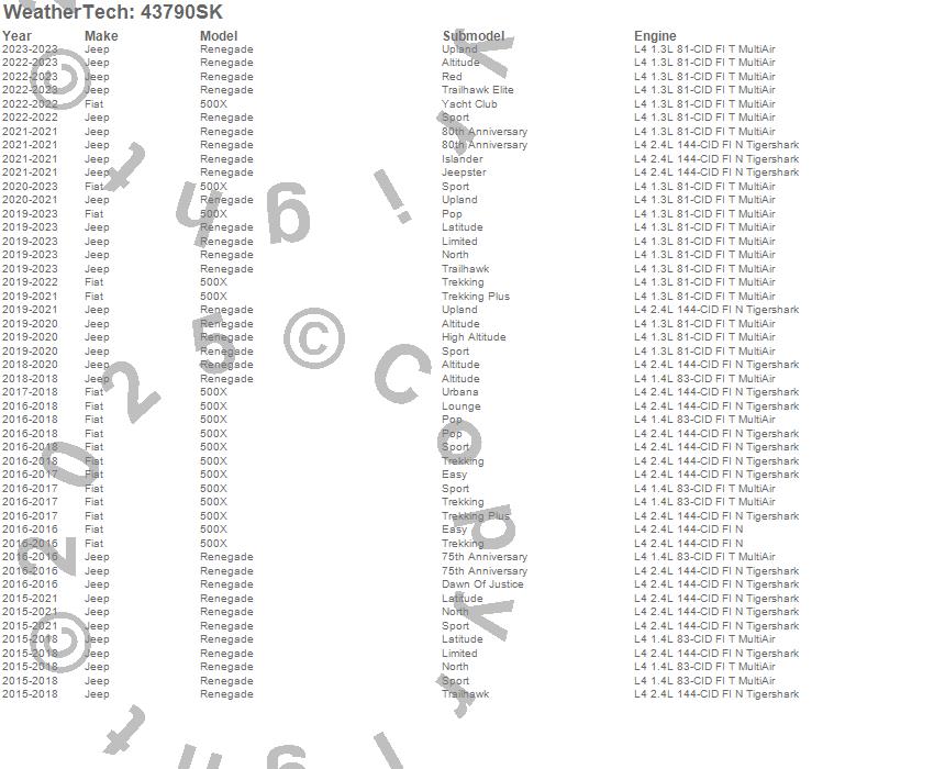 Below is an abbreviated list of applications for the Cargo Liner w/Bumper Protector.500X, Renegade, Fiat, Jeep, 2023, 2022, 2021, 2020, 2019, 2018, 2017, 2016, 2015