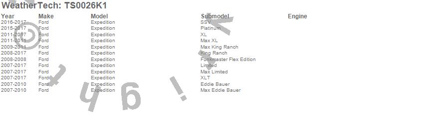 Below is an abbreviated list of applications for the WeatherTech SunShade Full Vehicle Kit.Expedition, Navigator, Ford, Lincoln, 2017, 2016, 2015, 2014, 2013, 2012, 2011, 2010, 2009, 2008, 2007