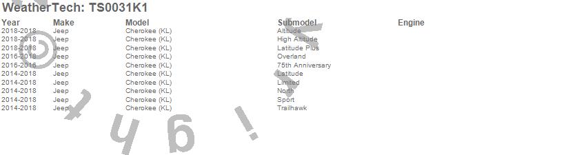 Below is an abbreviated list of applications for the WeatherTech SunShade Full Vehicle Kit.Cherokee (KL), Jeep, 2018, 2017, 2016, 2015, 2014