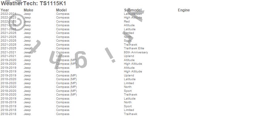 Below is an abbreviated list of applications for the WeatherTech SunShade Full Vehicle Kit.Compass, Jeep, 2026, 2025, 2024, 2023, 2022, 2021, 2020, 2019, 2018
