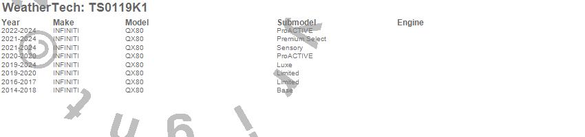 Below is an abbreviated list of applications for the WeatherTech SunShade Full Vehicle Kit.QX80, INFINITI, 2024, 2023, 2022, 2021, 2020, 2019, 2018, 2017, 2016, 2015, 2014