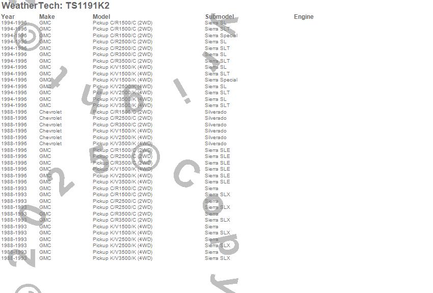 Below is an abbreviated list of applications for the WeatherTech SunShade Full Vehicle Kit.C1500 Pickup, C2500 Pickup, C3500 Pickup, K1500, K1500 Pickup, K2500 Pickup, K3500 Pickup, Chevrolet, GMC, 1996, 1995, 1994, 1993, 1992, 1991, 1990, 1989, 1988