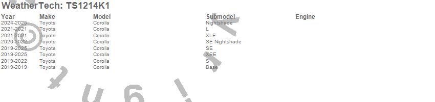 Below is an abbreviated list of applications for the WeatherTech SunShade Full Vehicle Kit.Corolla, Toyota, 2025, 2024, 2023, 2022, 2021, 2020, 2019