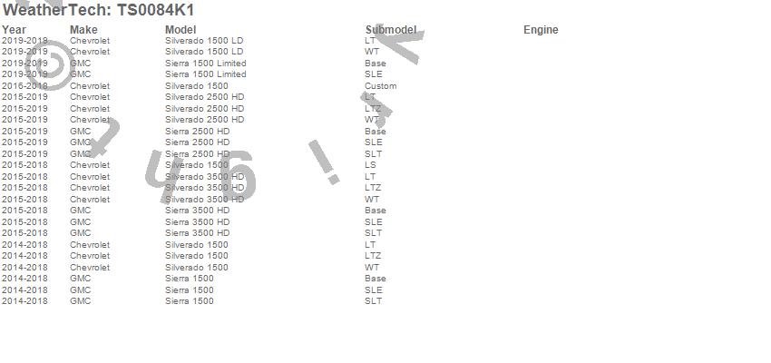 Below is an abbreviated list of applications for the WeatherTech SunShade Full Vehicle Kit.Sierra 1500, Sierra 1500 Limited, Sierra 2500 HD, Sierra 3500 HD, Silverado 1500, Silverado 1500 LD, Silverado 2500 HD, Silverado 3500 HD, Chevrolet, GMC, 2019, 2018, 2017, 2016, 2015, 2014