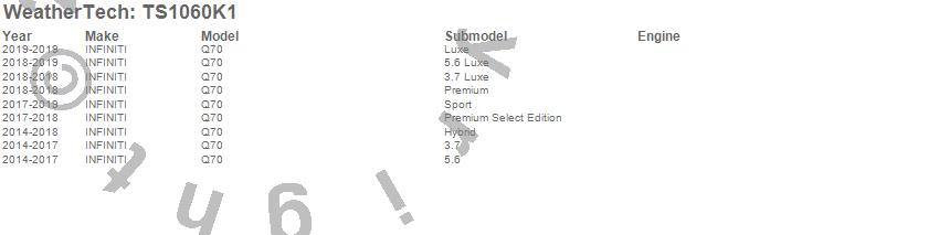 Below is an abbreviated list of applications for the WeatherTech SunShade Full Vehicle Kit.Q70, INFINITI, 2019, 2018, 2017, 2016, 2015, 2014