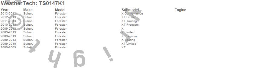 Below is an abbreviated list of applications for the WeatherTech SunShade Full Vehicle Kit.Forester, Subaru, 2013, 2012, 2011, 2010, 2009